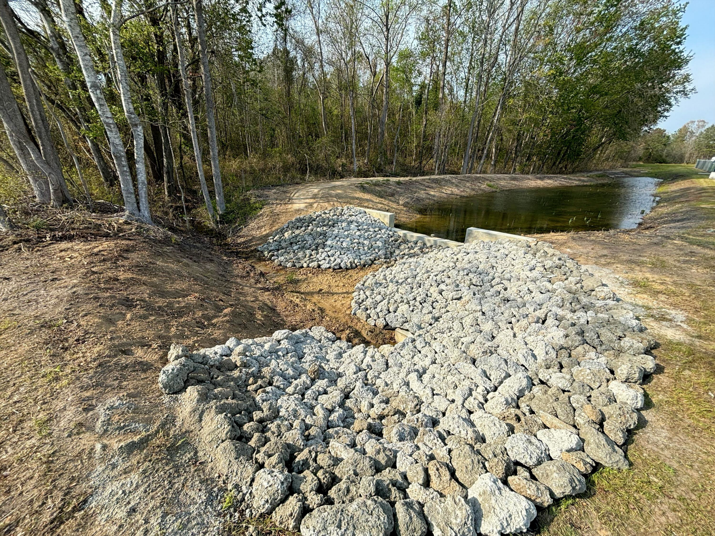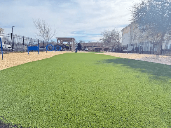 Scenic waterfront view with green lawn, palm tree, two white chairs, and a long wooden pier extending into the calm water.